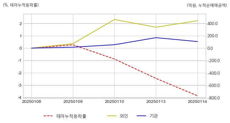조선기자재 테마는 최근에 소폭의 조정이 있었지만 오늘 다시 반등을 시도하며 전일 대비 3.40% 상승하고 있다. 이 기간 동안 외국인과 기관은 관련 종목을 443.99억원, 106.11억원어치 사모았고, 개인은 -352.75억원 순매도 한 것으로 나타났다.