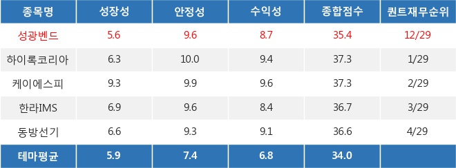 성광벤드의 퀀트 재무 점수는 35.43점으로 조선기자재 관련 다른 종목 평균 보다 안정성과 수익성 점수가 높아, 테마 내에서 12위를 차지했다.