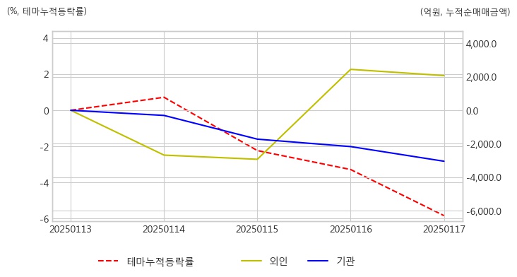 지난 5일간 큰 폭으로 하락했던 온디바이스 AI 테마가 이 시간 전일 대비 3.42% 오르며 강하게 반등하고 있다. 이 기간 동안 외국인은 관련 종목을 2,074.31억원어치 사모았고, 기관과 개인은 각각 -3,046.65억원, -267.82억원 순매도 한 것으로 나타났다.