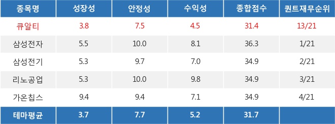 ◆큐알티의 퀀트 재무 점수 31.45점, 테마 내 13위