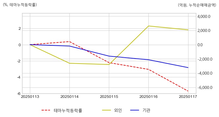 지난 5일간 큰 폭으로 하락했던 CXL(컴퓨트익스프레스링크) 테마가 이 시간 전일 대비 3.55% 오르며 강하게 반등하고 있다. 이 기간 동안 외국인은 관련 종목을 2,086.97억원어치 사모았고, 기관과 개인은 각각 -3,225.69억원, -96.34억원 순매도 한 것으로 나타났다.