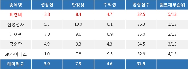 이는 재무적인 측면에서 티엘비의 대내외 경제환경 변화에 대한 대응 능력과 효율적인 수익창출 능력이 테마 내 다른 종목에 비해 양호함을 알 수 있다.