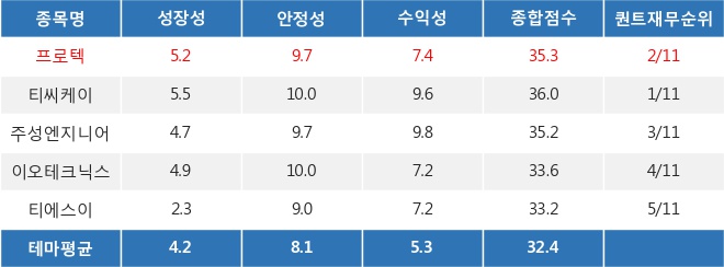 프로텍 성장성, 안정성, 수익성 모두 테마의 평균 점수를 상회하면서 퀀트 재무 순위 2위(총 11종목)를 차지했다.