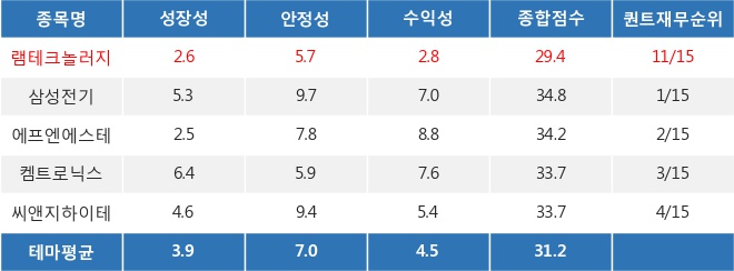 ◆램테크놀러지의 퀀트 재무 점수 29.42점, 테마 내 11위