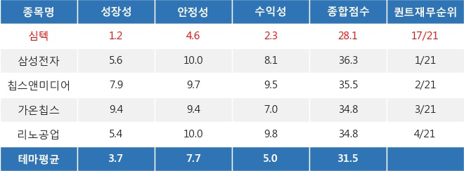 ◆심텍의 퀀트 재무 점수 28.11점, 테마 내 17위
